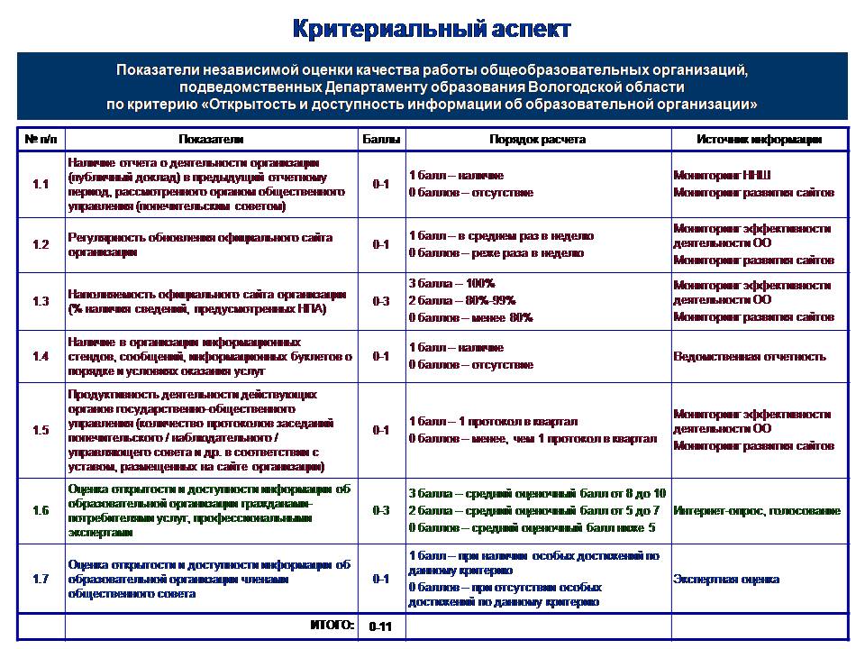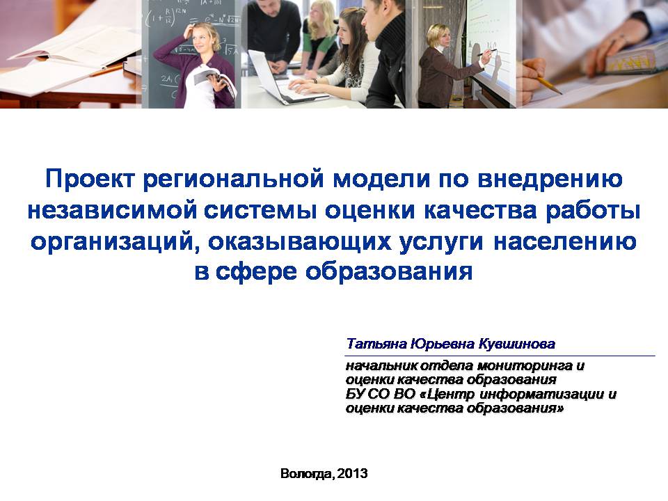 Одним из ведущих приоритетов национальной образовательной политики является построение общероссийской и региональных систем оценки качества образования, функционирующих для успешного управления образованием на основе объективных данных о состоянии системы образования на различных уровнях и тенденциях ее развития. В Вологодской области ведется работа над формированием и развитием региональной системы оценки качества образования (далее – РСОКО) с 2004 года. Одним из направлений оценки, проводимых в рамках РСОКО, является оценка качества работы образовательных учреждений. Данная оценка до последнего времени включала в себя две составляющие: – государственная оценка, включающая такие процедуры, как лицензирование и аккредитация, итоговая аттестация и т.д. – самооценка, в которую входят самообследование образовательного учреждения, промежуточная аттестация обучающихся, внутренняя система оценки качества образования. В настоящее время в связи с выходом Указа Президента Российской Федерации от 7 мая 2012 года № 597 «О мероприятиях по реализации государственной социальной политики» и вступлением в силу Федерального Закона от 29 декабря 2012 года № 273-ФЗ «Об образовании в Российской Федерации» внимание общественности и учредителей образовательных учреждений обращено на независимую оценку качества образования и в том числе качества работы организаций, оказывающих услуги населению в сфере образования (далее – образовательные организации). Данная оценка осуществляется как участниками образовательного процесса (обучающимися, родителями), так и гражданами, экспертами, общественностью, независимыми организациями, которые не являются участниками образовательного процесса. Таким образом, потребители образовательных услуг, общественность и обычные граждане смогут влиять на качество образовательных услуг. Следует отметить, что в нашем регионе элементы независимой оценки работы образовательных организаций используются с 2009 года в форме ежегодного мониторинга удовлетворенности населения качеством образовательных услуг. Тем не менее, эта оценка не является системной, полностью независимой и, главное, не оказывает значительного влияния на качество оказываемых образовательных услуг. Для того, чтобы мнение граждан могло действительно учитывалось и влияло на развитие системы образования, необходимо использовать не отдельные элементы независимой оценки, а сформировать систему независимой оценки качества работы образовательных организаций.