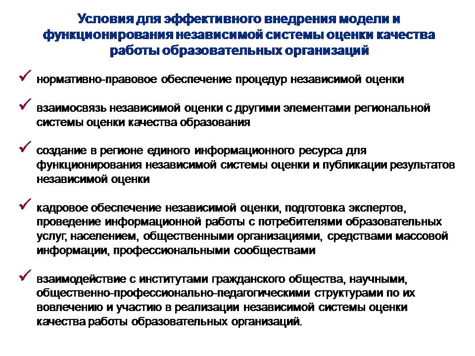 Представленная модель является одним из инструментов реализации политики в области создания и внедрения независимой системы оценки качества работы образовательных организаций. В ней отражен общий подход к структуре, функционированию и развитию такой системы. Эффективность реализации модели и функционирования независимой системы оценки зависит от выполнения ряда условий: нормативно-правовое обеспечение процедур независимой оценки; взаимосвязь независимой оценки с другими элементами региональной системы оценки качества образования; создание в регионе единого ресурса для функционирования независимой системы оценки и публикации результатов независимой оценки; кадровое обеспечение независимой оценки, подготовка экспертов, проведение информационной работы с потребителями образовательных услуг, населением, общественными организациями, средствами массовой информации, профессиональными сообществами; взаимодействие с институтами гражданского общества, научными, общественно-профессионально-педагогическими структурами по их вовлечению и участию в реализации независимой системы оценки качества работы образовательных организаций. Создание и соблюдение данных условий позволит обеспечить дальнейшее развитие независимой системы оценки и повысить качество оказания образовательных услуг в Вологодской области.